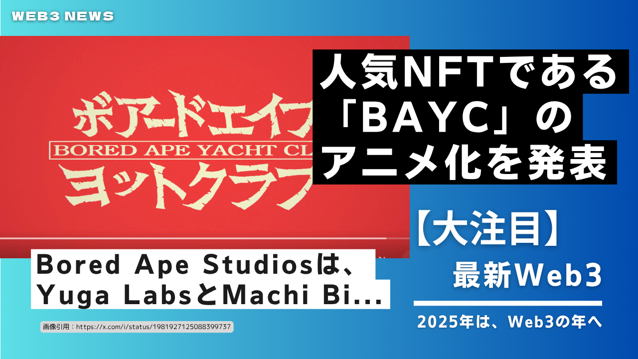 Bored Ape Studiosは、Yuga LabsとMachi Big Brother率いるSix Studiosの共同事業として、初のアニメシリーズ「Bored Ape Yacht Club」を発表した。