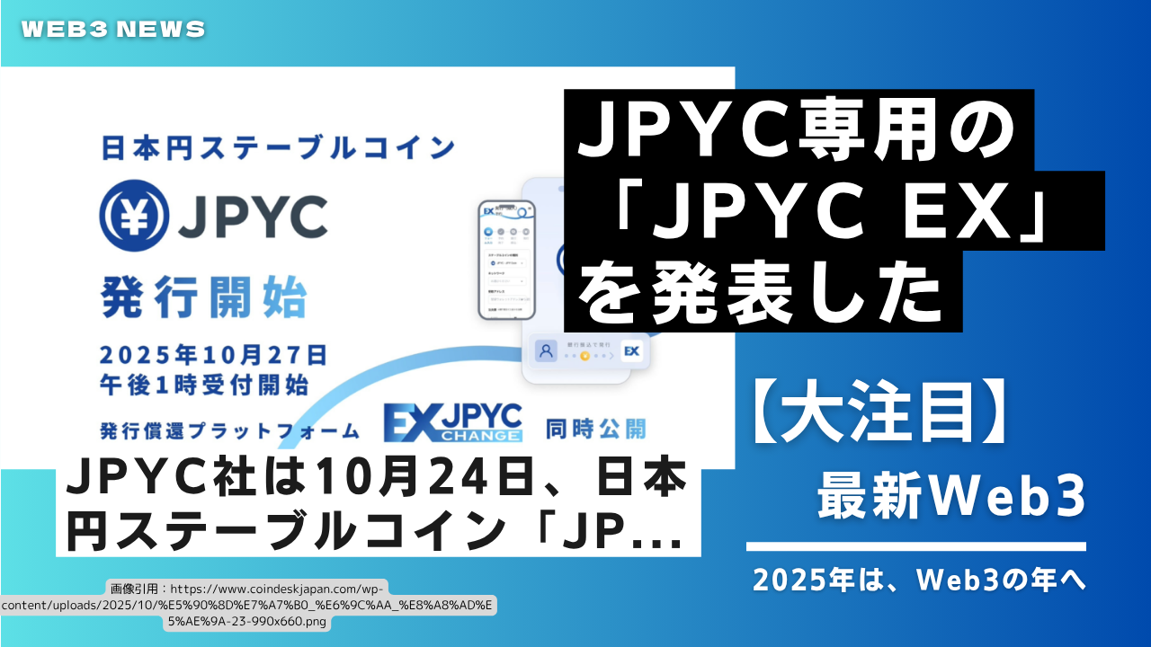 JPYC社は10月24日、日本円ステーブルコイン「JPYC」の専用プラットフォーム「JPYC EX」を発表した。