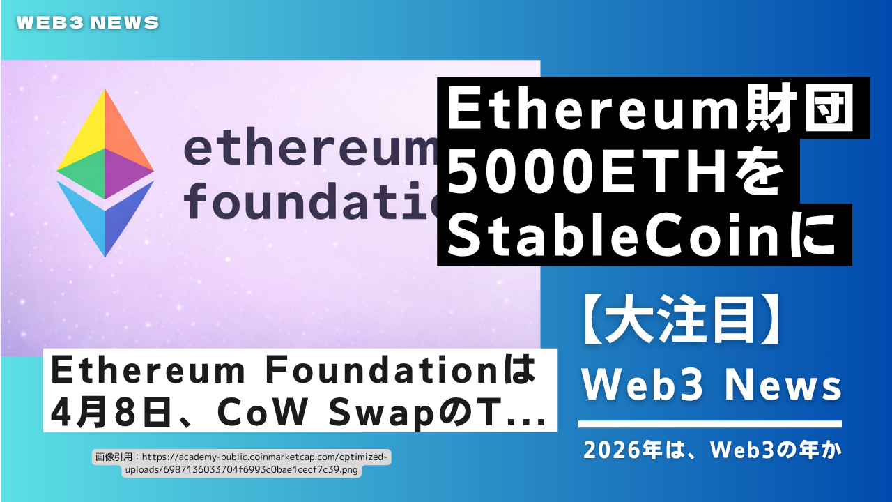 Ethereum Foundationは4月8日、CoW SwapのTWAP機能を使い5000ETHをステーブルコインへ変換すると発表した。